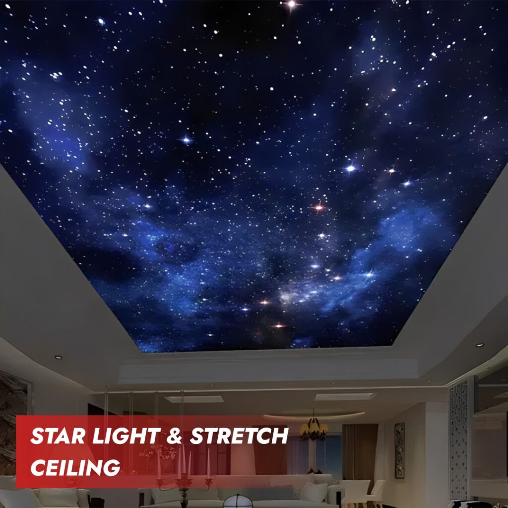 Transform your living space with Alisan Smart Homes’ Star Light & Stretch Ceiling. Our innovative ceiling solutions create a stunning, starry sky effect that adds a touch of luxury and elegance to any room. The stretch ceiling offers a sleek, flawless finish, while the integrated star lights provide a mesmerizing ambiance. Perfect for bedrooms, living rooms, and commercial spaces, Alisan’s Star Light & Stretch Ceiling combines aesthetic appeal with modern technology for a truly unique and captivating environment. Experience the magic and sophistication with Alisan Smart Homes.